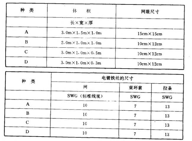 多數(shù)水力結構的防洪堤及下游漸變部分將部分地或全部地依照圖紙所示或工程師的指示用石籠墊加以防護,根據(jù)尺寸的不同下表列出4種石籠墊。