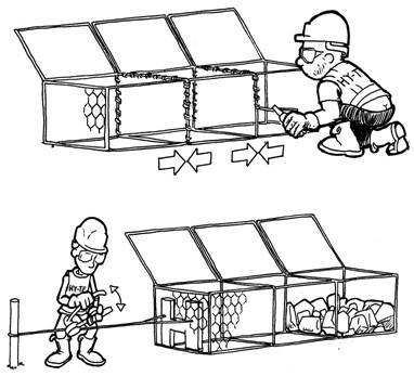 4、如果尺寸一樣的格賓石籠網(wǎng)需要并列連接在一起使用(組成格賓石籠網(wǎng)擋墻),就把個(gè)的末端和第二個(gè)的前端相連接,以此類推。在后一個(gè)網(wǎng)箱的內(nèi)側(cè)高1/3處,放置一個(gè)簡(jiǎn)單的木質(zhì)的“H”型,另外一側(cè)進(jìn)行拉伸,讓其緊繃,直到所有的網(wǎng)箱都處于拉伸、緊繃的狀態(tài)。