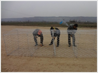 4.前板、后板和尾板大致向垂直方向開口,呈開口箱形。 側(cè)翼應(yīng)適當(dāng)折疊并相互重疊。 所有隔板和尾板應(yīng)固定并固定在前后板上。 組裝時,鍍鋅石籠網(wǎng)應(yīng)與周圍表面、尾部和空間一起安裝,并應(yīng)確保所有折痕處于正確的方向,每個側(cè)面的頂部水平。 后,鍍鋅石籠網(wǎng)的邊緣通過絞合鋼絲連接。
